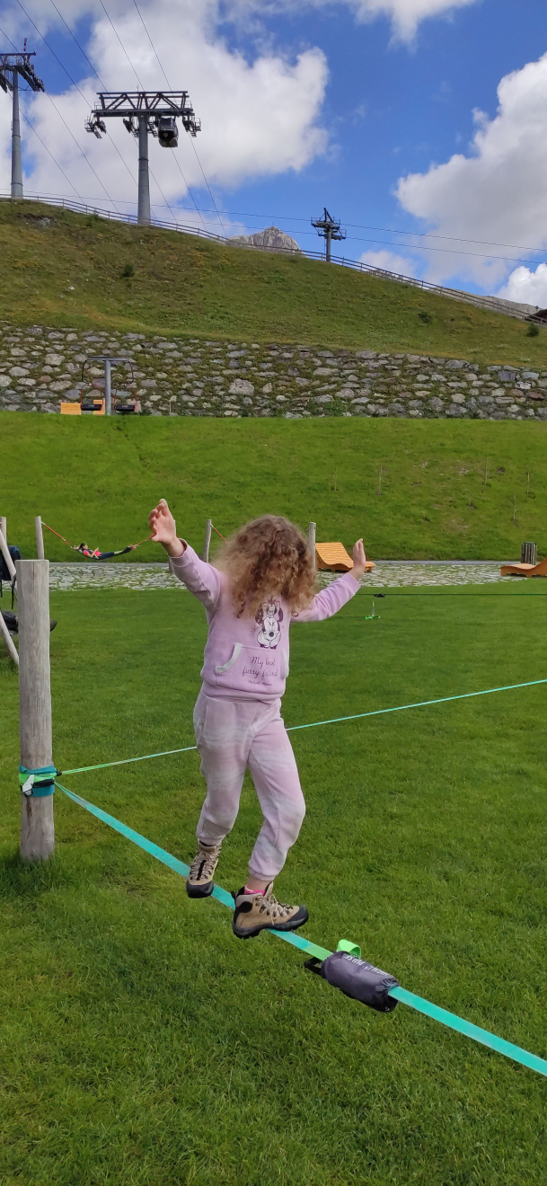 Ну и плюс ко всему, курс, к сожалению, был намного хуже, чем обещали. Ленивый класс не захотел собирать приправы, поэтому в итоге они просто играли на детской площадке, как-то делали из готового теста пиццу и начиняли ее готовым сыром и салями. И в итоге у Буни было еще достаточно энергии, поэтому мы поехали обратно в Ишгль, а оттуда прямо до средней станции канатной дороге на машине (там достаточно широкая дорога, никого джипа не надо). А оттуда пошли к Schwarzwasser See. С неплохой площадкой для скалолазания и, опять же, слэклайном!