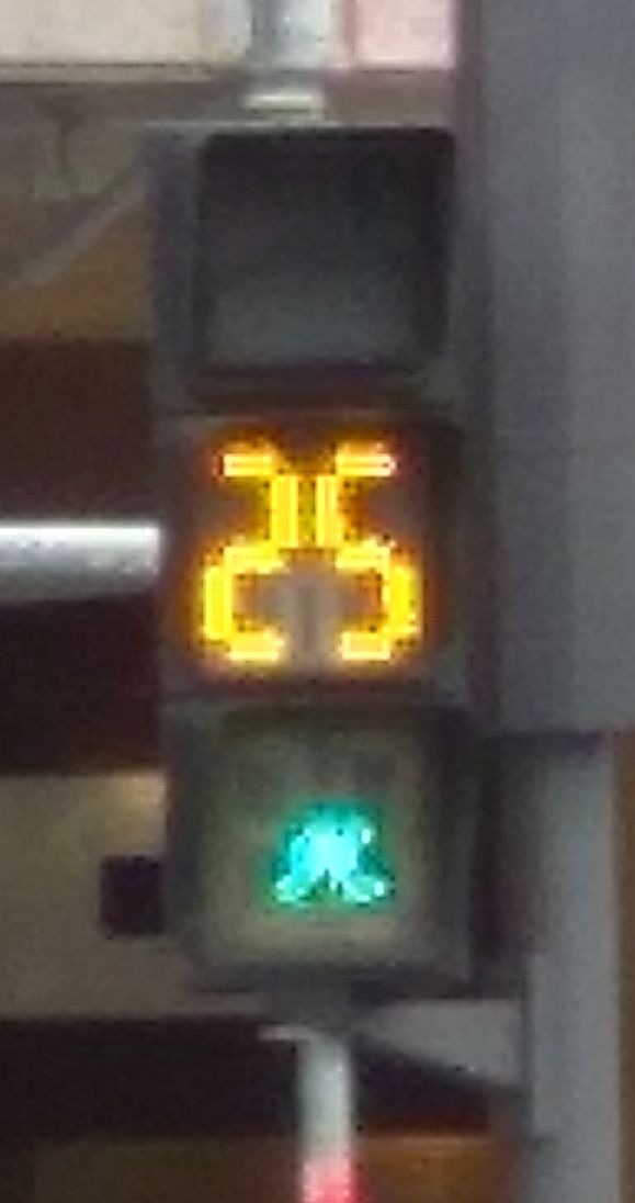 Зато по дороге обратно на детскую площадку мы обратили внимание на интересный дизайн пешеходного светофора. Он не только считает секунды, но и место ячейки светофора меняется в зависимости от того, красный сейчас или зеленый.